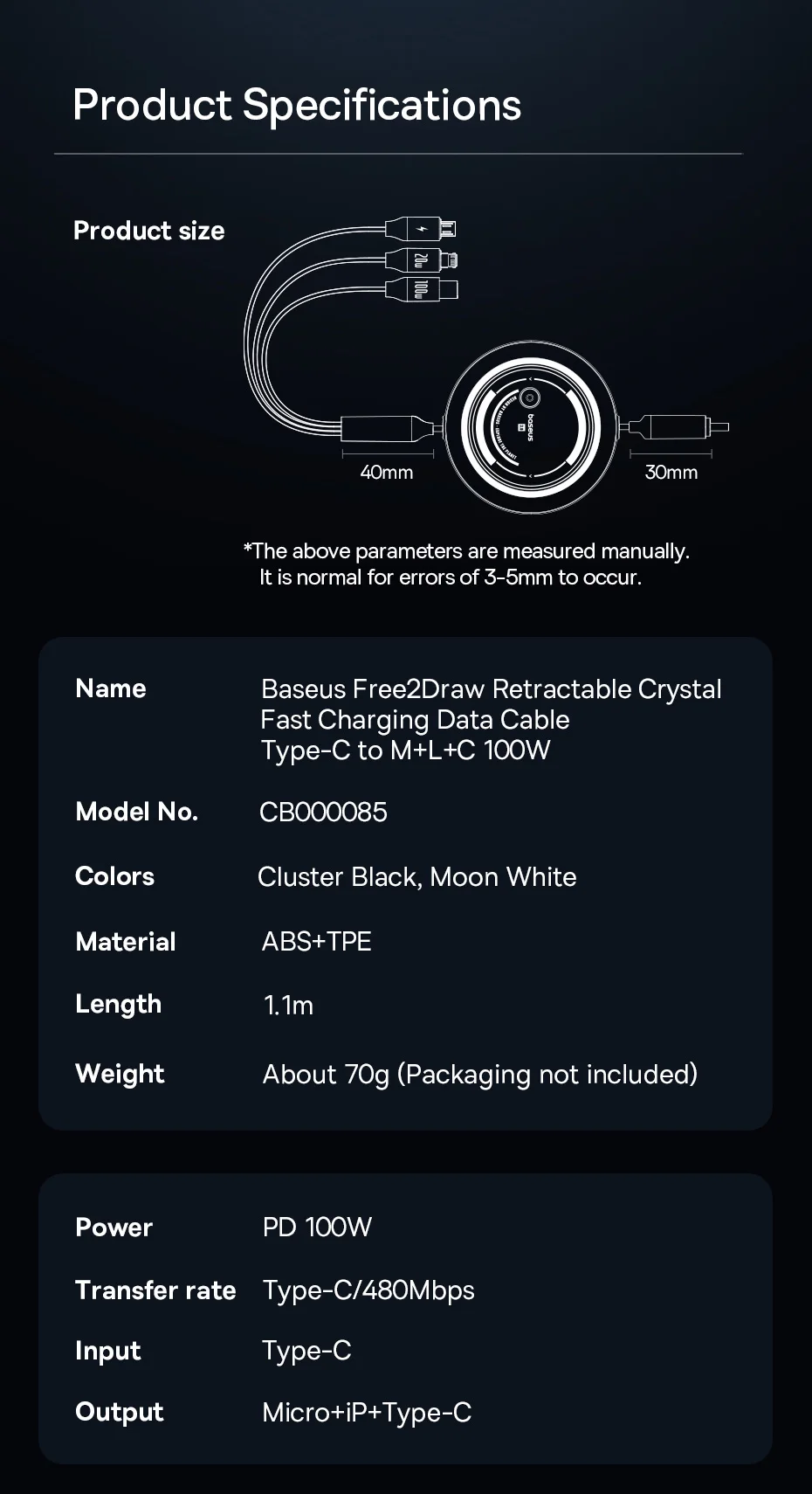 Say goodbye to the traditional slow-charging retract-able cables; the retractable cables are downward compatible with 30W/27W/20W/18W fast charging.