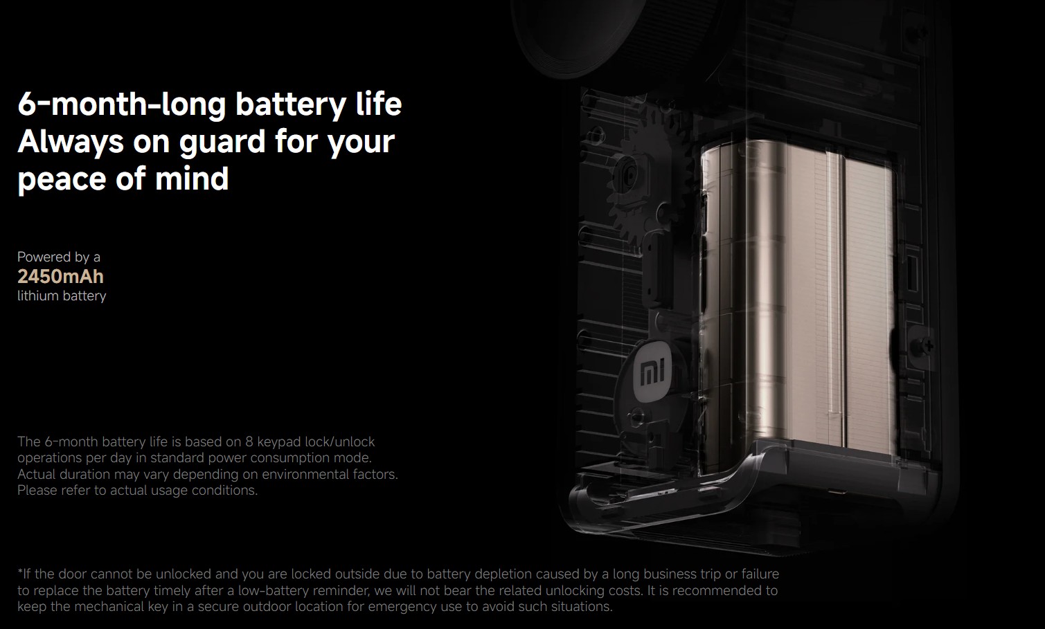 *The lithium battery lasts for 6 months based on standard usage of 10 lock/unlock cycles per day at 25°C. Actual battery life may vary depending on usage conditions. Battery performance decreases in low temperatures, resulting in a shorter battery life. Please refer to actual usage.