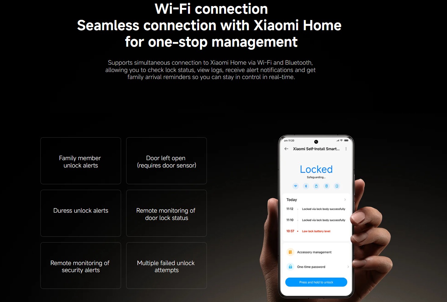 *To view the smart lock's logs remotely and receive abnormal alerts, call notifications, low battery reminders and so on, ensure the lock is connected to Wi-Fi or that your phone maintains a Bluetooth connection.