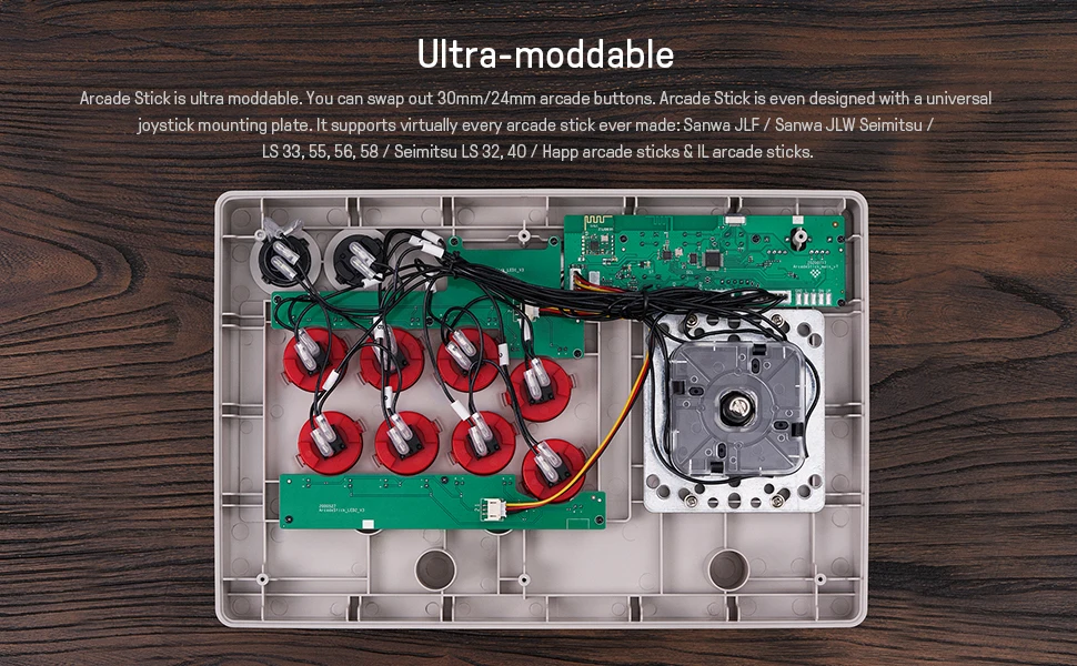 1. Support ultimate software - Customize button mapping and create macros. Ultra-moddable arcade Stick - universal mounting plate supports Sanwa, seimitsu, happy & Built arcade sticks. Wireless Bluetooth support. 2.4G support with included wireless 2.4G receiver.