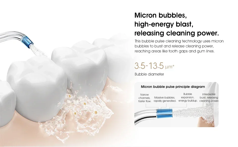 This bubble pulse cleaning technology uses micronoubbles fo burst and release cleaning power,reaching areas like tooth gaps and gum lines.