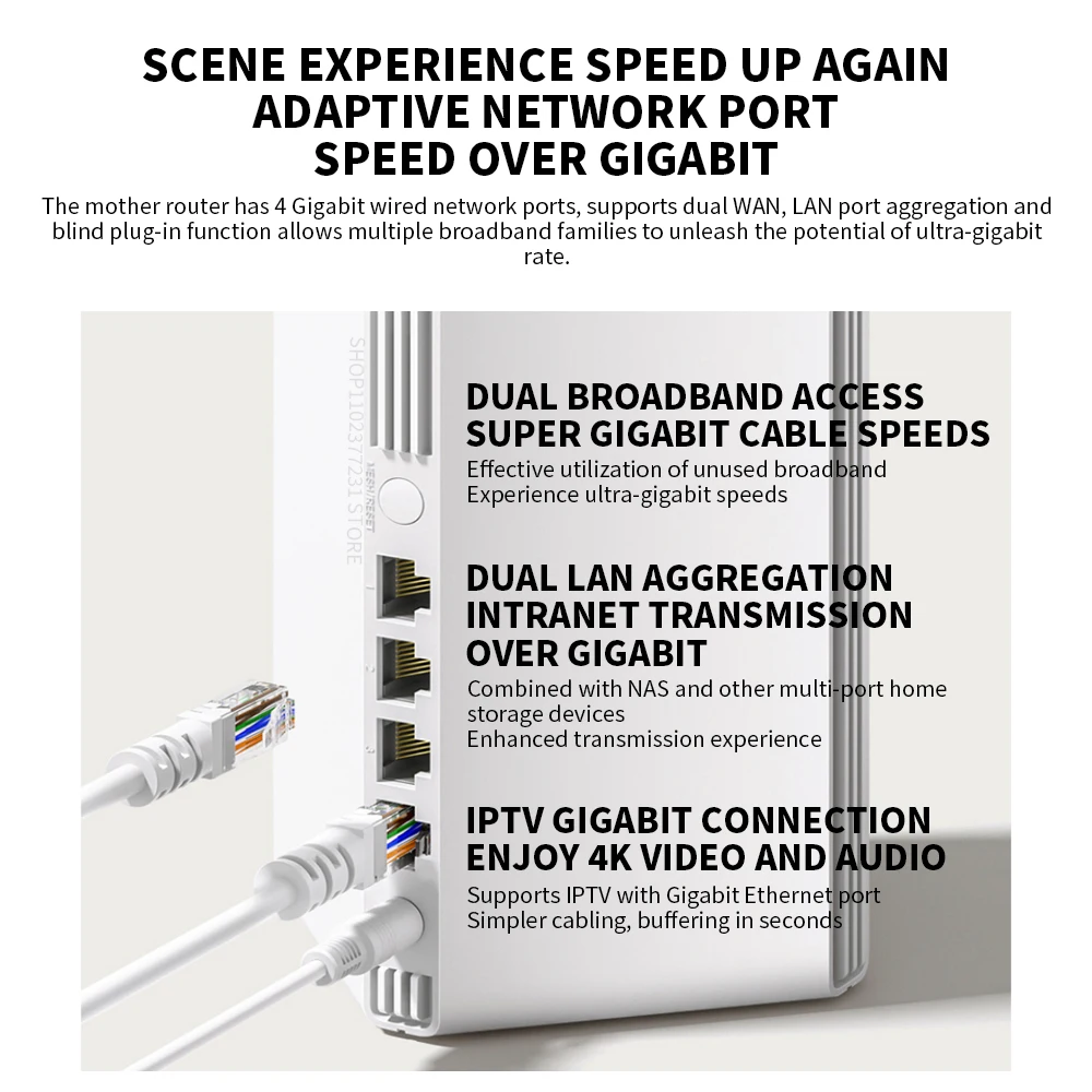 -The mother router has 4 Gigabit wired network ports, supports dual WAN, LAN port aggregation and blind plug-in function allows multiple broadband families to unleash the potential of ultra-gigabit rate.